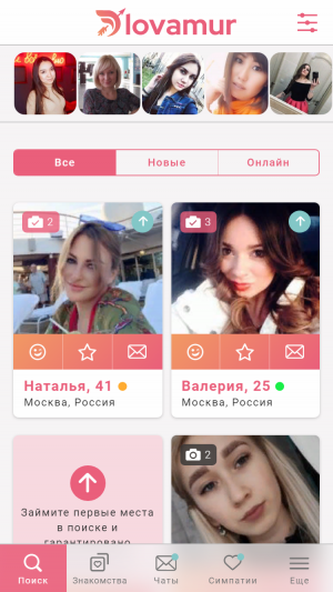 Сайт LOVAMUR – удобная площадка для поиска новых знакомств. Аудитория сервиса ежедневно пополняется новыми анкетами. Регистрация с верификацией не пропускает фейковые анкеты и ботов, поэтому общение на сайте живое, а пользователи – реальные. LOVAMUR понравиться всем, кто ориентирован на серьёзные отношения.
