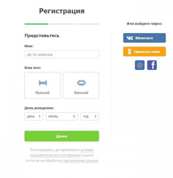 Система попросит нового пользователя ввести такие данные, как: имя, пол, дата рождения, цель знакомства, город, адрес электронной почты и придумать пароль аккаунта.