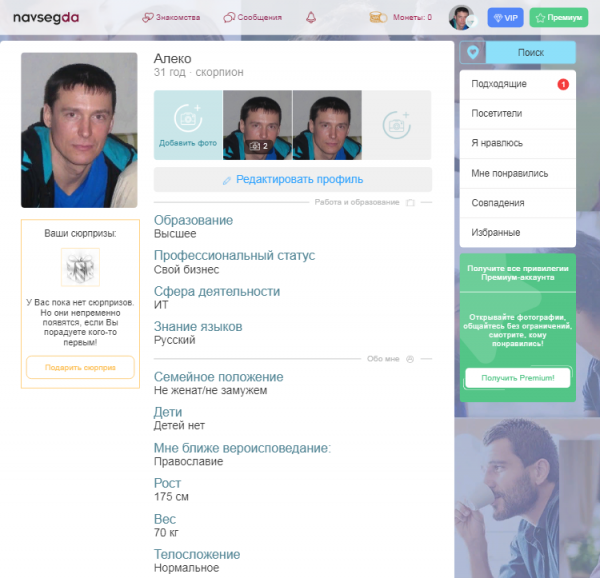 После подтверждения e-mail, сервис предложит рассказать о себе, описать свою внешность, уровень образования, род занятий. Вы сможете указать своё семейное положение, наличие детей, отношение к алкоголю и курению. В анкете можно загрузить до 5 фотографий, выбрав одну из них для аватарки. После заполнения профиля, аккаунт активируется и появится доступ ко всем бесплатным функциям площадки.
