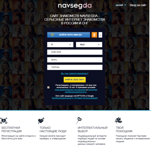 Navsegda обещает пользователям старше 18 лет помощь в поиске спутника жизни, интересного собеседника, партнёра для сексуальных отношений. Сайт Навсегда открывает доступ к функционалу только после регистрации, которая происходит бесплатно как для мужчин, так и для женщин.