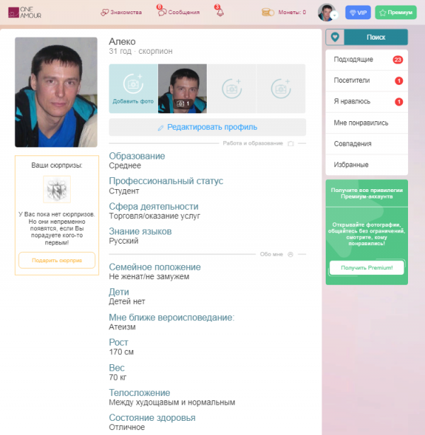 Единственное условие – пользователю сайта знакомств OneAmour должно быть не меньше 18 лет. Услуги виртуального клуба знакомств можно назвать условно-бесплатными. Базовый функционал доступен в бесплатном режиме, расширенные возможности появляются у пользователей, которые подписались на платный Премиум-тариф или приобрели VIP-статус.