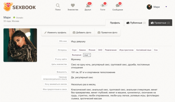 В настройках на сайте «SexBook» можно управлять личным аккаунтом, добавлять фото, ставить или убирать уведомления о наличии новых сообщений, блокировать и разблокировать пользователей, добавлять их в друзья. Каждая анкета проходит предварительную проверку, поэтому вероятность фейковых страниц и мошенников здесь минимальна.