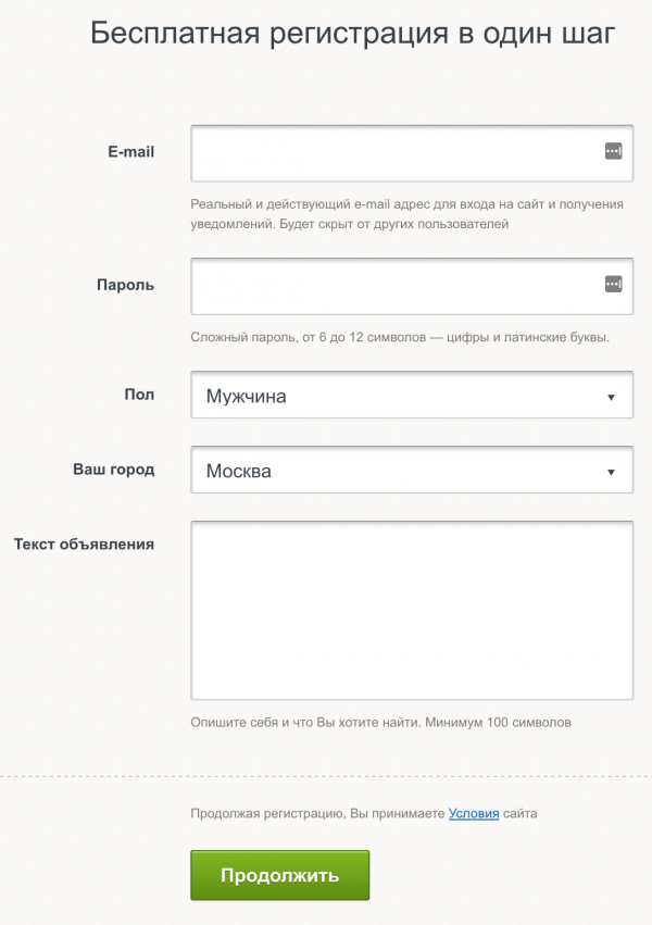 Регистрация на сайте проста, стандартна и не займет много времени. После нее желательно максимально заполнить анкету, прописывая в ней важную информацию о себе, своих параметрах, предпочтениях и пожеланиях.